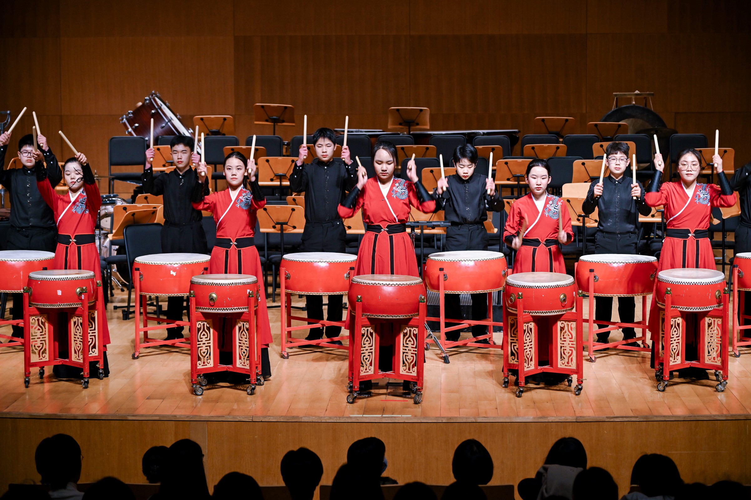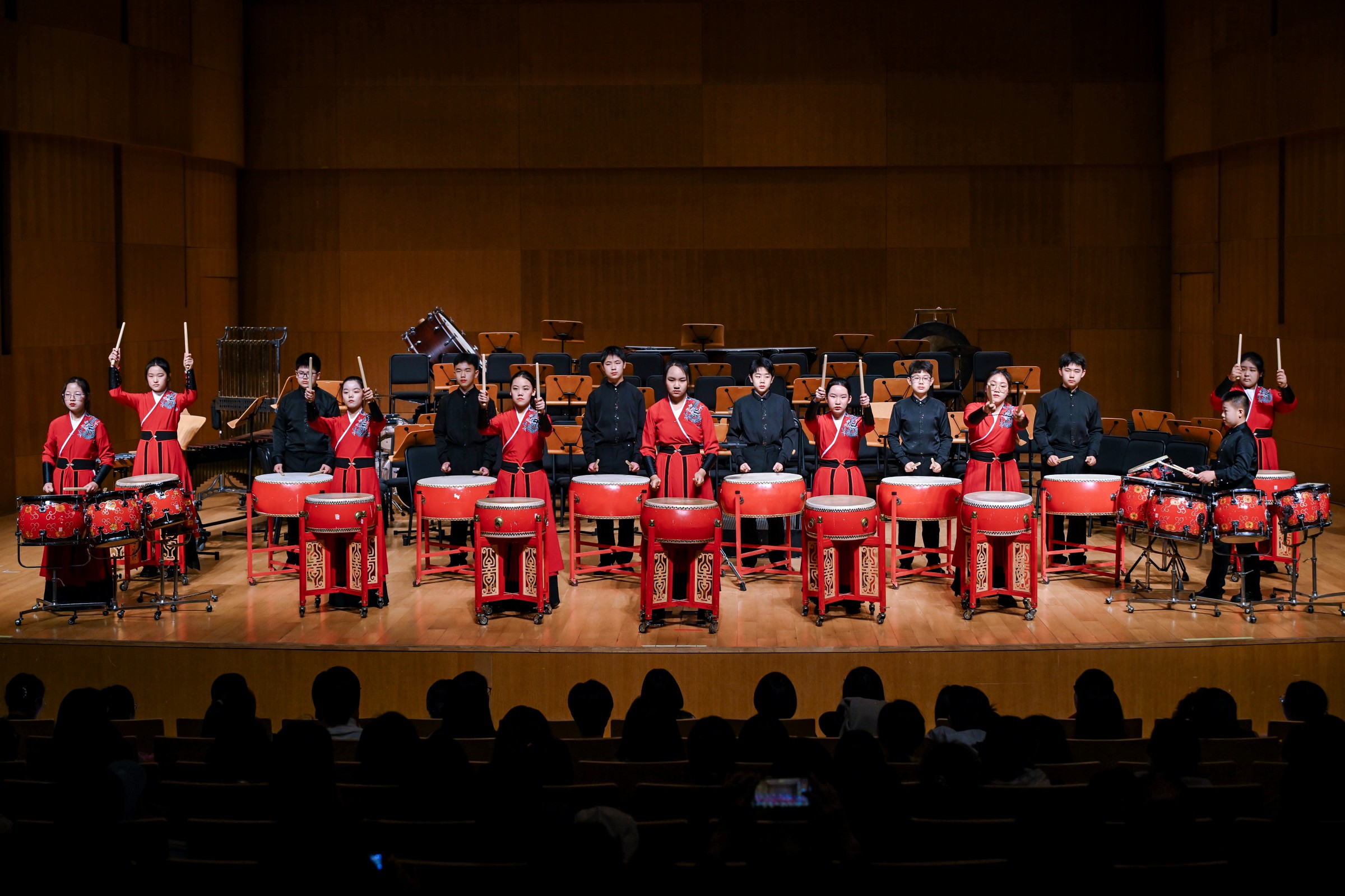 本次音乐会分器乐篇、合唱舞蹈篇两个篇章,集团各校区、成员校共计14支参演队伍轮番登台,呈上21个精彩节目。音乐会在集团管乐团(朝花团)激昂的《勇往直前进行曲》《蓝色山脉Blue Ridge Saga》演奏中拉开帷幕,铿锵旋律瞬间点燃现场氛围。朝来校区民族打击乐团《鼓诗》鼓声震天,尽显民族器乐魅力;集团成员校中国教育科学研究院朝阳实验学校管乐团(金帆团)《阿什兰公园》旋律婉转,展现专业功底;和平街初中校区民乐团《云宫迅音》《男儿当自强》经典新编,让传统民乐焕发新活力。
